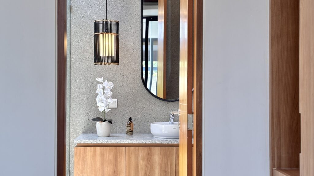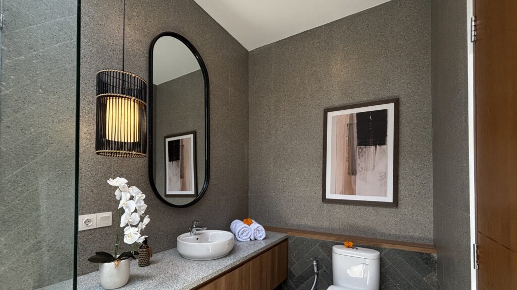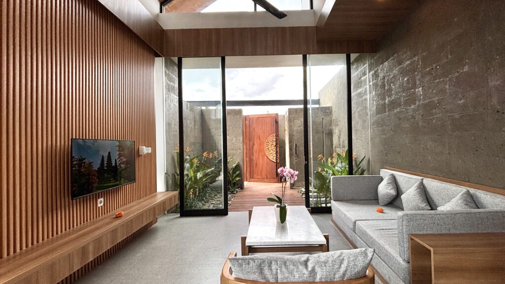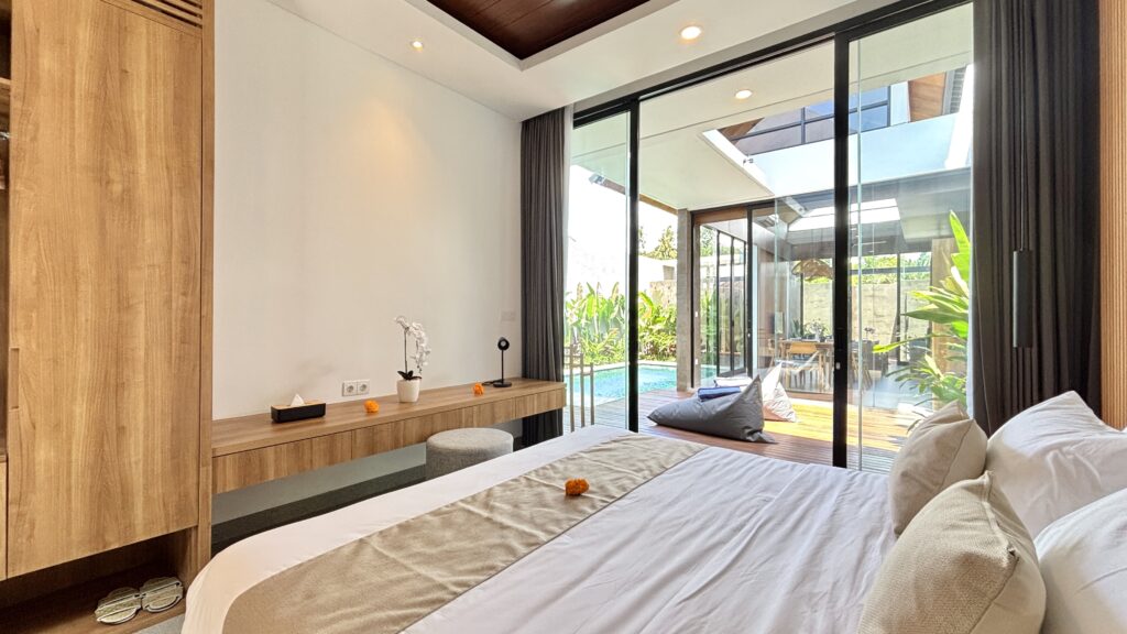 Every corner of the villa has been thoughtfully curated to create a sense of openness and relaxation. The architecture embraces Bali’s natural surroundings through airy layouts, warm textures, and large windows that welcome natural light throughout the day. The living space flows effortlessly between indoor and outdoor areas, allowing guests to enjoy the tropical climate while relaxing in stylish, comfortable interiors. Carefully selected furnishings, soft neutral tones, and natural materials create an environment that feels both sophisticated and inviting.