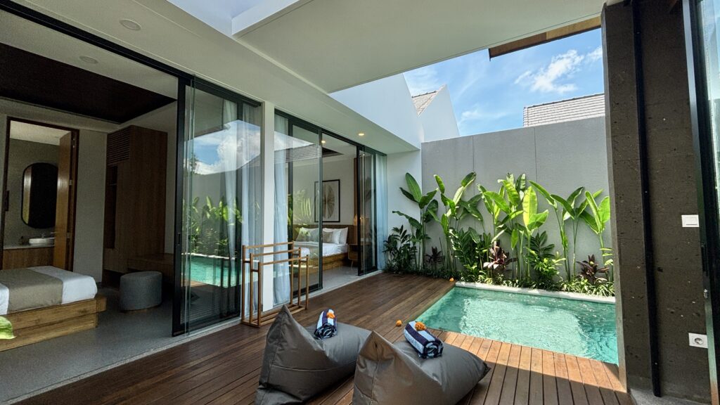 the private swimming pool, surrounded by lush greenery that enhances the sense of privacy and calm. Whether you start your morning with a refreshing swim, spend the afternoon lounging under the tropical sun, or unwind in the evening with the soft sounds of nature, the pool area offers a peaceful sanctuary designed for pure relaxation.
